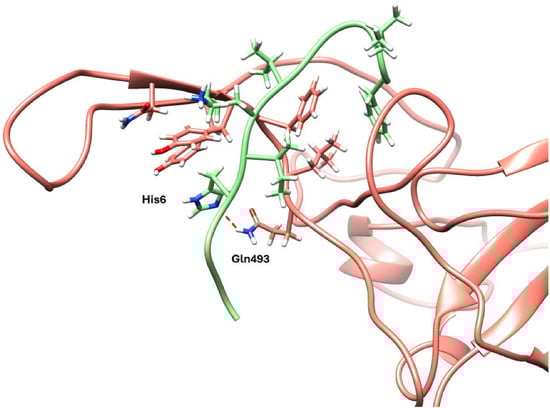 The final frame of the MD simulation showing the interaction between peptide 10 (in green) and the receptor-binding domain (RBD) (in salmon) in a cartoon representation. A preserved hydrogen bond (red dashed line) between the Gln493 residue on the RBD and the His 6 on PEP10 is highlighted with a red dashed line. Hydrophobic/aromatic interactions between nonpolar side chains of the RBD (e.g., Tyr489, Phe490, and Leu492) and PEP10 (e.g., Ala5, and Ile7) are also illustrated, suggesting stabilizing forces in the peptide–receptor complex. Selected residues are shown in stick representation where oxygen, nitrogen, and hydrogen atoms are shown in red, blue, and white, respectively; carbon atoms are shown in the same color as the PEP10 or RBD, respectively.