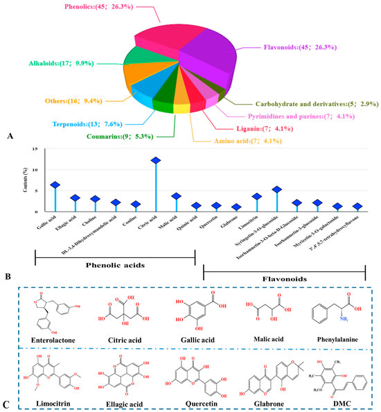 A total of 171 compounds were identified in the ethanol extract of the S. nervosum flower buds, including flavonoids, phenolics, amino acids, alkaloids, coumarins, lignans, terpenoids, other substances, etc. (Figure 1, Figure S3 and Table S2). For the identified compounds, the most abundant components were flavonoids (such as quercetin, glabrone, and limocitrin) and phenolic acids (such as gallic acid, ellagic acid, and other organic acids) (Figure 1B). The result here was consistent with previous observations, which demonstrated that the flower buds of S. nervosum were mainly composed of flavonoids, phenolics, and triterpenoids that might contribute to their various pharmacological activities [6,12,13]. Flavonoids and phenolic acids are well-known antioxidant molecules in plant materials due to the phenolic hydroxyl groups presented in their structure [22], suggesting that the flower bud extracts of S. nervosum could serve as potential antioxidant ingredients used for nutraceutical and nutricosmetic products. Based on the content of identified phytochemicals through LC-QTOF-MS (Table S2) and the proven bioactive components in the flower buds of S. nervosum, 10 major compounds were assumed to be the most promising compounds that contribute to the nutraceutical and nutricosmetic properties of the flower bud extracts (Figure 1C).