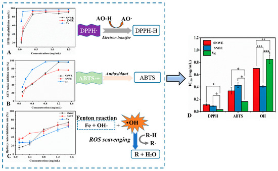The inhibitory effects and mechanisms of the S. nervosum extracts on free radicals. DPPH radical inhibition rates (A). ABTS radical inhibition rates (B). Hydroxy radical inhibition rates (C). IC50 value (D). * indicates significance at p ≤ 0.05. ** indicates significance at p ≤ 0.01. *** indicates significance at p ≤ 0.001. SNEE: S. nervosum ethanol extract. SNWE: S. nervosum water extract. Vc: ascorbic acid.