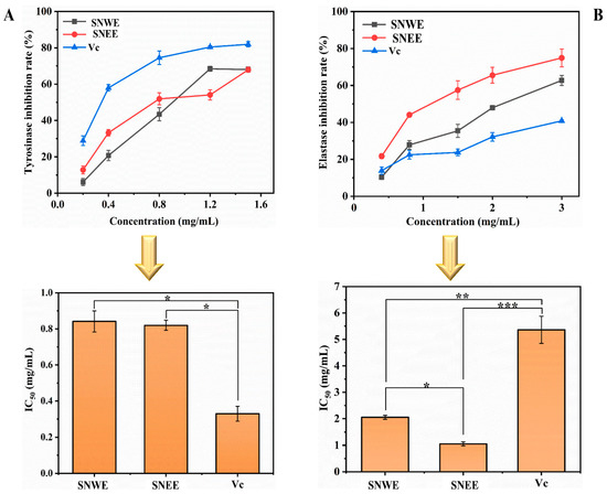 Tyrosinase inhibitory activity (A) and elastase inhibitory activity (B) of the S. nervosum extracts. * indicates significance at p ≤ 0.05. ** indicates significance at p ≤ 0.01. *** indicates significance at p ≤ 0.001. SNEE: S. nervosum ethanol extract. SNWE: S. nervosum water extract.