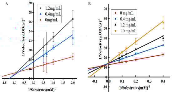 Elastase belongs to the chymotrypsin family of proteases, and it is responsible for the degradation of elastin as well as other proteins that are fundamental for forming a supportive framework and maintaining the elasticity of the skin [19]. The excessive hydrolysis of the dermal elastin is strongly correlated to skin aging and wrinkles, so elastase inhibitors are often adopted as anti-wrinkle agents for promoting the preservation of skin elasticity [5]. As shown in Figure 3B, the SNEE exhibited the highest elastase inhibitory activity (IC50 = 1.05 mg/mL), which was significantly (p ≤ 0.05) greater than that of the SNWE (IC50 = 2.05 mg/mL) and the positive control (IC50 = 5.36 mg/mL). For human skin, elastase can be activated by reactive oxygen species (ROS) and causes extrinsic skin aging circumstances, suggesting that the antioxidant components might also serve as promising anti-aging ingredients [19]. The efficient antioxidant and anti-elastase capacity of the extracts observed (Figure 2 and Figure 3B) suggested that S. nervosum flower buds revealed great potential for developing new anti-aging and anti-wrinkle agents. The enzyme inhibitory activities of the S. nervosum flower buds on α-glucosidase and urease have been well-clarified [6,18], while its effects on tyrosinase and elastase have seldom been reported in previous work. In order to better understand its tyrosinase/elastase inhibitory mechanism, the enzyme inhibition kinetics of the SNEE were further evaluated.