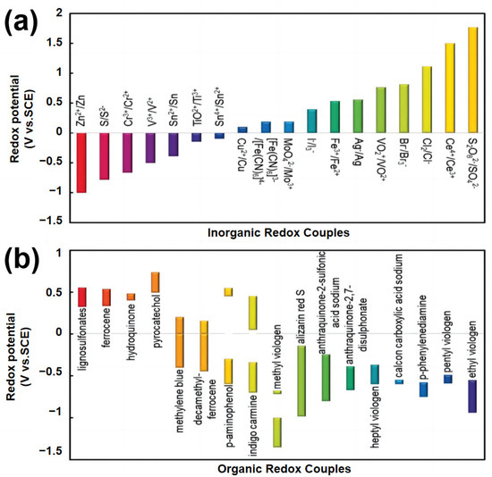 Redox potentials of various inorganic (a) and organic (b) redox electrolytes used for the construction of redox electrolyte-enhanced electrochemical capacitors [55].