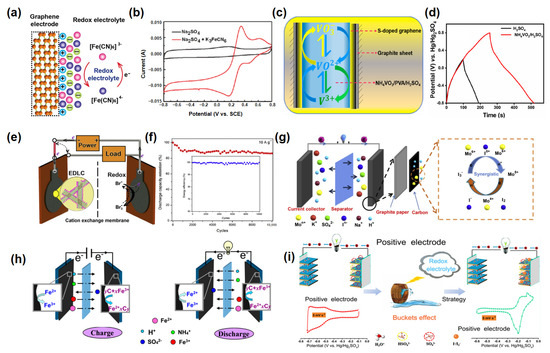 (a) Charge storage mechanisms of graphene paper electrode in the redox-electrolyte system and (b) cyclic voltammetry (CV) curves [64]. (c) Redox reaction mechanism of NH4VO3 as a redox additive in a supercapacitor. (d) Galvanostatic charge–discharge (GCD) of SSG-2 with H2SO4 and NH4VO3/H2SO4[65]. (e) The schematic illustration of the redox-active electrolyte supercapacitor. (f) Digital image of FCNT electrodes [66]. (g) The electrochemical reaction mechanism of the synergistic effects between Na2MoO4 and KI in the mixed electrolyte [67]. (h) Schematic drawing of the electrochemical reaction mechanism of FAS in the mixed electrolyte [68]. (i) Enhancement strategy for positive electrode in MXene-based symmetric SCs by redox electrolyte introduction [69].
