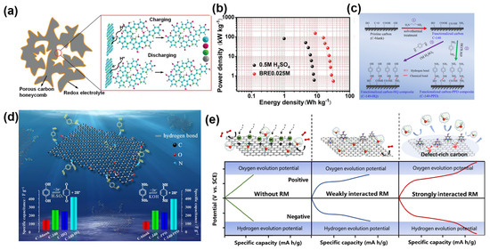 (a) Redox reaction involved with the BRE0.025 M electrolyte. (b) Comparison of energy densities in different systems [73]. (c) Schematic diagram of the interaction and reaction mechanism between ethylenediamine (EDA)-functionalized porous carbon and p-phenylenediamine (PPD)/hydroquinone (HQ). (d) Schematic diagram of the hydrogen bonding interaction between EDA-functionalized porous carbon and PPD/HQ [74]. (e) Schematic diagram of the effect of the interaction between RMs and defect-rich carbons on the voltage window and capacitance of aqueous SCs [75].