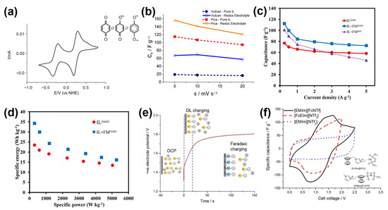 (a) CV of p-benzoquinone (p-BQ) in IL (PYR14TFSI). (b) Specific capacitance vs. scan rate curves of SCs with different electrodes and electrolytes [89]. (c) Calculated specific capacitance via GCDs of different combinations (NrGO with IL, NrGO with IL + FM, and rGO with IL + FM). (d) Ragone plots of NrGO with IL and IL + FM [90]. (e) The positive electrode’s charging potential profile exhibits the processes occurring during charging. (f) CV curves of two-electrode cells containing 80 wt.% IL in acetonitrile [91].