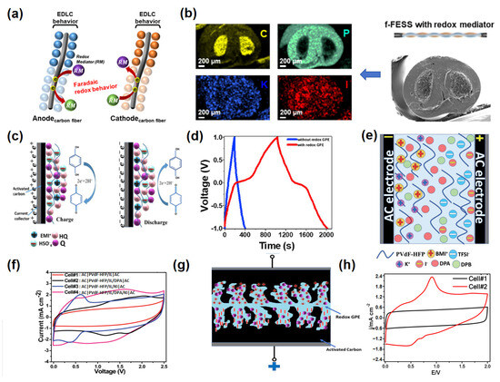 (a) Schematic representation depicting the Faradaic redox process mediated by the RM and the EDLC effect in the flexible fiber-shaped energy storage system (f-FESS) incorporating RM. (b) SEM and EDX mapping images of the f-FESS utilizing a redox-active KI polymer-gel electrolyte [101]. (c) Schematic diagram of the charge–discharge process of a supercapacitor with a redox-active electrolyte (containing hydroquinone). (d) Contribution of redox processes to the capacitance of the supercapacitor [102]. (e) Schematic illustration of the supercapacitor cell employing a redox-active gel polymer electrolyte (GPE) incorporating dual redox additives (PVDF-HFP/BMITFSI/DPA/KI) and AC electrodes. (f) CV curves of supercapacitor cells with different GPEs (Cell#1–Cell#4) at a 10 mV s⁻¹ scan rate for comparison [62]. (g) The SC cell schematic based on non-aqueous, redox-active GPE and AC electrodes. (h) Comparative CV curves of the capacitor cells (with and without redox-active GPE), recorded at a scan rate 5 mV s−1 [103].