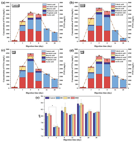 Changes in VFA concentrations in the AD system of food waste: (a–d) VFA composition in experimental groups; (e) pH variations. Statistically difference between day 2 and 5: p < 0.05 (*). Data were collected from three parallel experimental sets.
