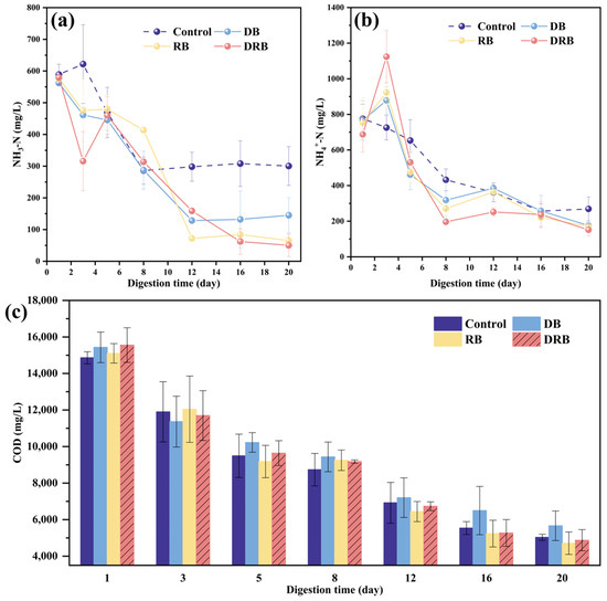 High ammonia nitrogen concentrations can inhibit methane production by reducing the abundance and activity of methane-related genes and enzymes, ultimately lowering AD efficiency [19]. Ammonia nitrogen in water typically exists as ionized ammonium (NH4+-N) and unionized ammonia (NH3-N) [59,60]. In this study, the NH3-N removal rate for the control group was 49.01%, while the experimental groups—DB, RB, and DRB—achieved significantly higher removal rates of 74.21%, 88.66%, and 91.32%, respectively (Figure 3a). The NH3-N removal rate in the control group was significantly lower than those in all experimental groups (DB, RB, and DRB). Additionally, the removal rate in the DB group was significantly lower than those of the RB and DRB groups. However, no significant difference was observed between the RB and DRB groups (p > 0.05), indicating comparable performance between the two. Among the experimental groups, DRB demonstrated exceptional performance, achieving a 42.31% improvement over the control group. As shown in Figure 3b, the concentration of NH4+-N increased in all treatments except for the control group on day 3, suggesting that the addition of BC facilitated the hydrolysis rate of AD, thereby promoting the release of substantial amounts of NH4+. By day 20, the greatest decrease in NH4+-N concentration was observed in the DRB. Overall, the highest removal of ammonia nitrogen by DRB may be attributed to the protonation of functional groups (C=O, COO−) on DRB surfaces (Figure S2d–i), which imparts a partial positive charge, thereby reducing the polar attraction of NH4+ ions in solution [61] and contributing to pH regulation. Similar adsorption mechanisms have been reported in studies utilizing BC and zeolite for ammonia nitrogen removal [62,63,64].