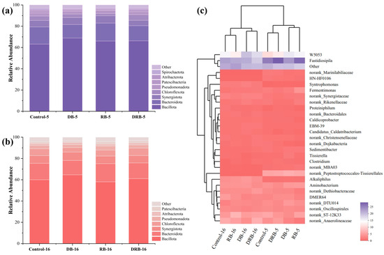Bacterial community structures at the phylum level on day 5 (a) and day 16 (b); genus level on day 5 and day 16 (c).