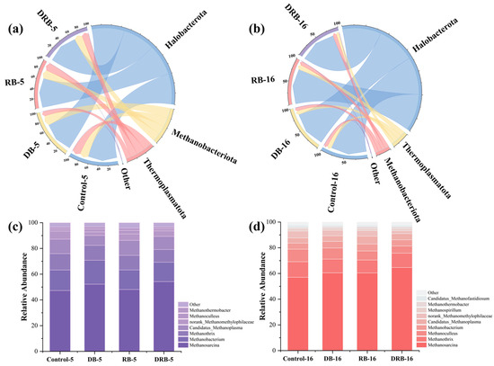Archaeal community structure at the phylum level on day 5 (a) and day 16 (b); genus-level analysis on day 5 (c) and day 16 (d).