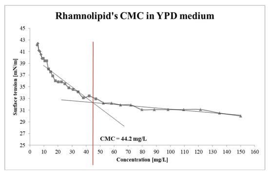 The measurements were carried out on a Krüss, K6 tensiometer (Krüss, Hamburg, Germany) using the du Noüy ring method. A 10 mL solution of RLs dissolved in YPD medium at a concentration of 150 mg/L was prepared. The surface tension of the YPD medium, RLs solutions, and their series of dilutions were measured. CMC was calculated by measuring the surface tension of RL solutions prepared in a YPD medium at different concentrations. Subsequently, a curve was plotted based on the obtained results, and two tangents were drawn. The point of intersection between these tangents determines the CMC.