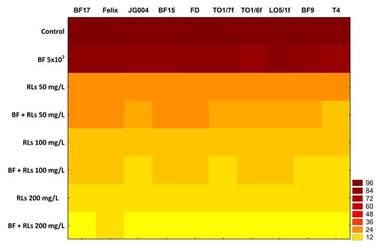 One hundred microliters of bacteriophage preparation with a previously determined phage titer were introduced into a plastic tube, and 100 µL of RLs were added to obtain final concentrations: 500 mg/L, 250 mg/L, and 125 mg/L. The final volume of the solutions was 200 µL. The mixtures were incubated for 24 h at 37 °C, and then phage titer was determined with a standard double-layer method [45].