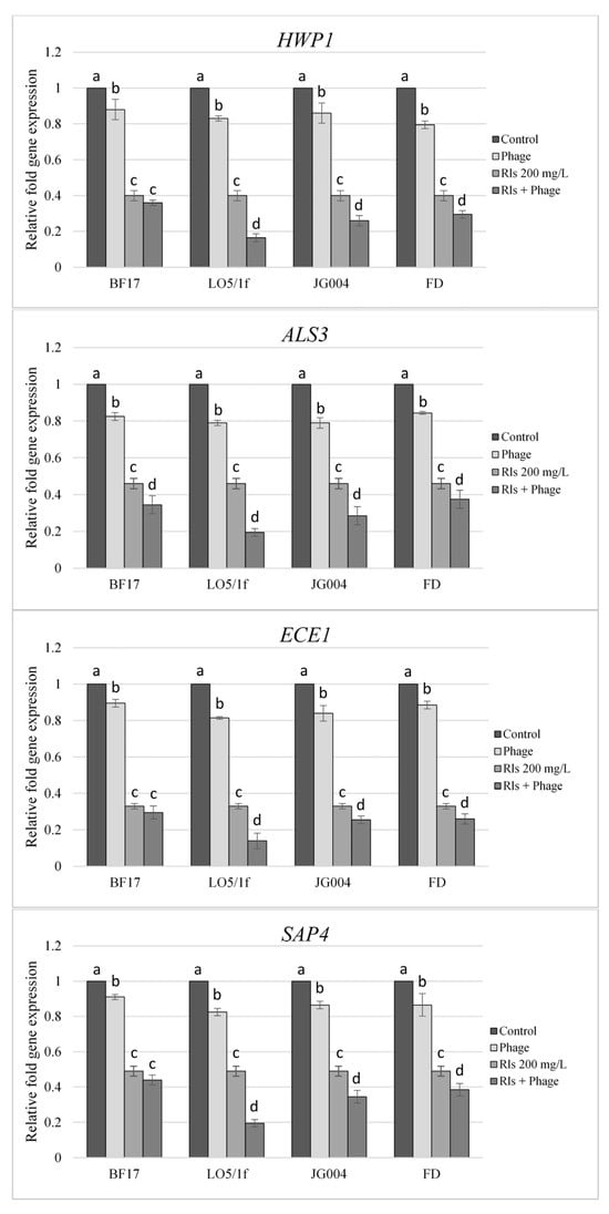 Expression of genes responsible for biofilm formation in Candida yeast treated with RLs, phages (BF17, LO5/1f, JG004, FD), and their combinations. Data are expressed as the means ± SD of the independent assays in triplicate. The same superscript letters designate homogenous groups comparing treatment samples within the same gene at a p-value of < 0.05.