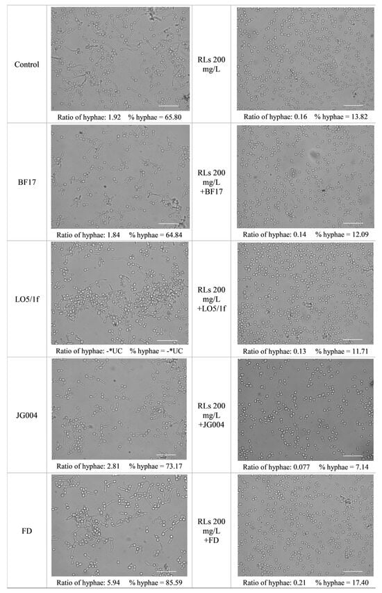 Effect of RLs, phages, and RLs/bacteriophages combinations on C. albicans mature hyphae. Scale bars = 50 µm. The ratio of hyphae (Ratio of hyphae) was determined as the number of hyphal cells divided by the number of yeast-form cells. The percentage of hyphal cells (% Hyphae) was calculated as the number of hyphal cells divided by the total number of cells (hyphal + yeast), multiplied by 100%. * UC—uncountable-cell counting is impossible due to extensive cell overlapping.