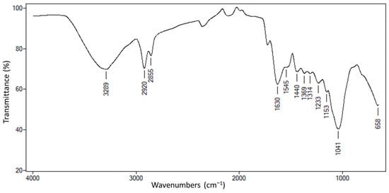 Carbohydrate analysis revealed glucose and mannose in the C. cajan leaves, with concentrations of 134 and 56 g kg−1, respectively. The Fourier transform infrared (FT-IR) spectrum of the C. cajan leaves revealed functional groups characteristic of lignocellulosic materials (Figure 1). The absorption bands at 3289 and 2920 cm−1 correspond to the stretching vibrations of the hydroxyl and aliphatic C–H functional groups, respectively, suggesting the presence of carbohydrates or amino acids, and lipids [19]. The band at 1707 cm−1 is associated with C=O stretching vibrations of the ester carbonyl or carboxylic acid functional group. Additionally, the –C=O absorption can be assigned to conjugated or nonconjugated, saturated or unsaturated amides, acids, or other systems. Peaks associated with aromatic C stretching were identified at 1545 and 1440 cm−1, whereas the peak at 1314 cm−1 can be attributed to C–H asymmetric deformation and COO− anion stretching. The bands in the 1440–1201 cm−1 range were assigned to C–O stretching and O–H deformation vibrations, which are likely part of the flavonoid structure [19]. Finally, the absorption band at 1024 cm−1 corresponds to the C–O stretching of either an ester or an ether, and the band at 752 cm−1 is attributed to CH bending.