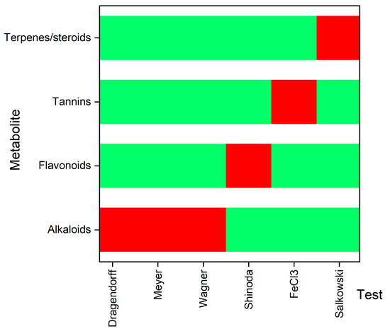The phytochemical analysis of C. cajan leaves shows the presence (red) and absence (green) of phytochemicals in six qualitative tests.