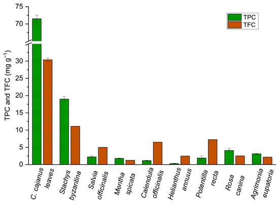 Ultrasound-assisted extraction using a 60% hydroethanolic solution yielded a total phenolic content (TPC) of 72 ± 1 mg gallic acid equivalents (GAE) g−1, a total flavonoid content (TFC) of 30.4 ± 0.5 mg quercetin equivalents (QE) g−1, and a total anthocyanin content (TAC) of 0.41 ± 0.01 mg g−1, confirming the bioactive potential of C. cajan leaves. A comparison of TPC and TFC values with other medicinal herbs is provided in Figure 3.