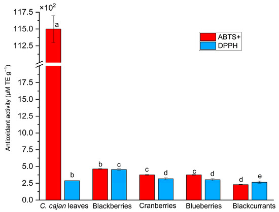 The antioxidant activity of C. cajan leaves was evaluated using ABTS and DPPH assays, which demonstrated that the leaf extract exhibited strong antioxidant activity, with a Trolox equivalent antioxidant capacity (TEAC) value of 11.5 ± 0.2 mM Trolox equivalents (TE) g−1 in the ABTS radical cation (ABTS+) scavenging assay and 289 ± 1 µM TE g−1 in the DPPH assay. Notably, the TEAC values from the ABTS assay were significantly higher (p < 0.05) than those from the DPPH assay. The antioxidant capacity of C. cajan leaves was then compared to that of commonly consumed berries, such as blackberries, cranberries, blueberries, and blackcurrants (Figure 4).