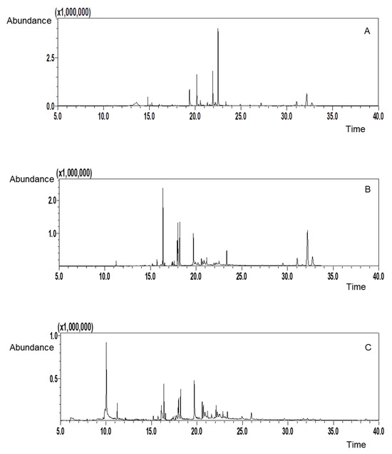 Total ion chromatograms obtained by gas chromatography–mass spectrometry (GC-MS) of C. cajan extracts. (A) Hydroethanolic crude extract, (B) ethanolic extract obtained by liquid–liquid extraction (LLE) with ethyl acetate (EtOAc), and (C) ethanolic extract obtained by LLE with hexane. The chromatograms display molecular ion peaks corresponding to the various compounds present in each extract. Differences in the profiles reflect variations in the chemical composition of the extracts based on the extraction solvent used. This analysis highlights the diversity of bioactive compounds in C. cajan leaves.