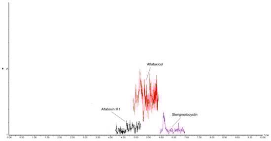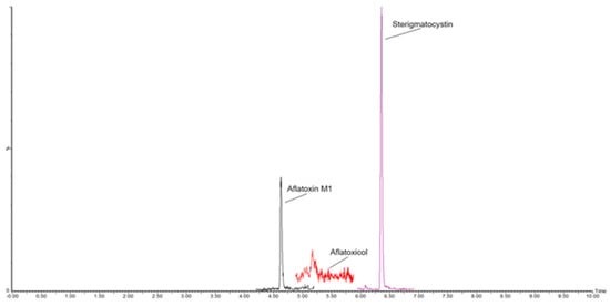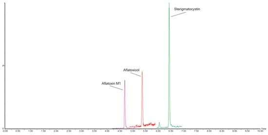 MRM chromatogram of a sheep ripened-hard cheese sample spiked with 25 ng/kg of Aflatoxin M1, 25 ng/kg of Sterigmatocystin, and 50 ng/kg of Aflatoxicol.