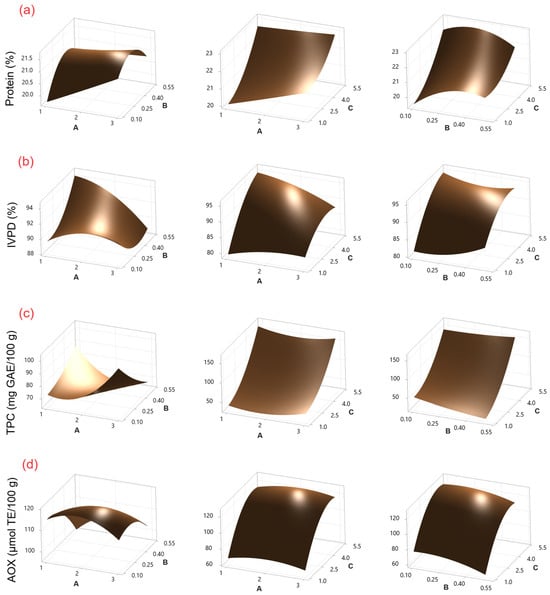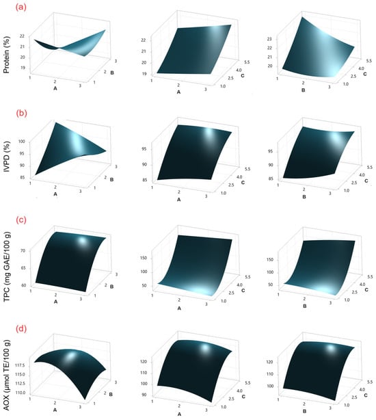 Surface response plots for (a) protein content, (b) IVPD, (c) TPC, and (d) AOX in chickpea sprouts treated with SU as an elicitor. Experimental factors: A = soaking time (h); B = SU concentration (% w/v); and C = sprouting time (days).