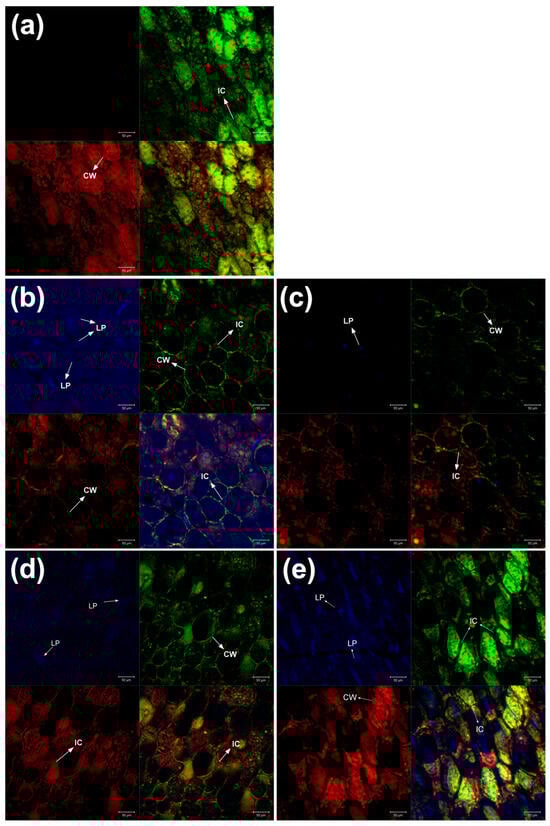 CLSM images (20X) of chickpea cotyledons. Fluorescent markers: Rhodamine (red), FITC (green), and Auramine O (blue). (a) Raw, (b) CH, (c) CCH, (d) SU, and (e) CSU. Abbreviations: CW: cell wall; IC: intercellular space; LP: lipid body.