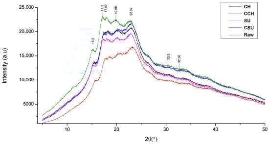 Furthermore, relative crystallinity in the raw sample was 64.78% and decreased to 50.48% in CH. However, in CCH, SU, and CSU, relative crystallinity increased to 65.56%, 68.23%, and 66.24%, respectively. These different degrees of crystallinity indicate differences in the chemical structure and composition of starches. During germination, starch granule hydrolysis occurs in a non-uniform manner, with amorphous regions being hydrolyzed first, followed by crystalline regions. As a result, crystallinity index values depend on the specific region being hydrolyzed, which may lead to either an increase or decrease in starch granule crystallinity [51].