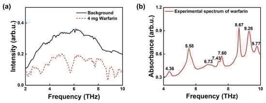 THz absorption spectra of warfarin in 4 to 10 THz. (a) frequency spectrum; (b) absorption spectrum.