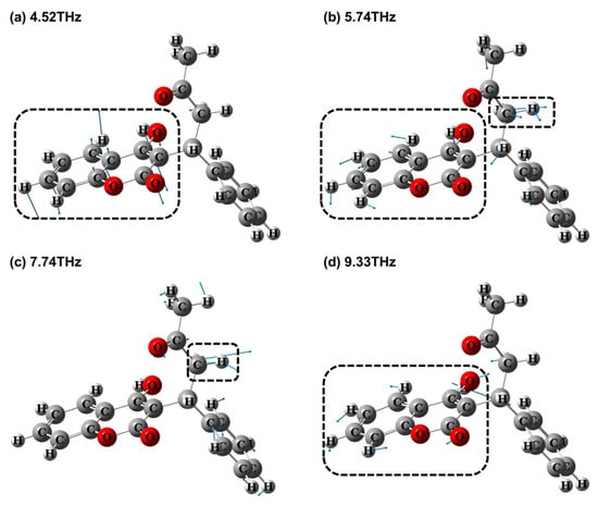 To understand the vibrational modes of the observed THz absorption peaks, we first analyze the four peaks (4.36, 5.58, 7.60, and 9.28 THz) that align well with the single-molecule model results. For each absorption peak identified through the DFT calculations, the corresponding molecular vibration mode is visualized in Figure 3. Specifically, the theoretical peak at 4.52 THz corresponds well with the measured peak at 4.36 THz, which is attributed to the out-of-plane bending vibration of the coumarin core (C9H5O3), as illustrated in Figure 3a. The theoretical peak at 5.74 THz aligns closely with the measured peak at 5.58 THz, which is primarily attributed to both rocking vibrations of the coumarin core (C9H5O3) and benzene ring (Ph), as depicted in Figure 3b. The theoretical peak at 7.74 THz corresponded to the measured peak at 7.60 THz, which mainly originates from the rocking vibration of CH2 and the rocking vibration of Ph, as shown in Figure 3c. The theoretical peak at 9.33 THz corresponded to the measured peak at 9.28 THz, which was mainly generated by the in-plane bending vibration of C9H5O3, as shown in Figure 3d.