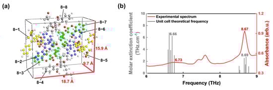 To further investigate the influence of intermolecular interactions for 6.73 THz and 8.67 THz peaks, we extended our theoretical calculations to the warfarin unit cell. The unit cell structure, comprising eight warfarin monomers (labeled 8-1 to 8-8), is depicted in Figure 4a. The unit cell dimensions measure 18.7 Å in length, 9.7 Å in width, and 15.9 Å in height. Theoretical predictions are compared with experimental results in Figure 4b. Experimentally observed peaks at 6.73 THz arise from the collective contribution of five resonant modes, corresponding to the coupled vibrations of warfarin monomers 8-1, 8-3, 8-4, 8-5, and 8-6. Compared to single-molecule calculations, the results of unit cell calculations show significant differences. This discrepancy arises because single-molecule calculations do not account for intermolecular interactions, such as hydrogen bonding. These interactions lead to notable peak broadening and a reduction in absorption intensity [37]. In contrast, the peak at 8.67 THz originates from six overlapping resonant modes, with all eight warfarin monomers in the unit cell participating in the vibrational coupling. Incorporating intermolecular interactions into the unit cell calculations improved the agreement with experimental data for the peaks at 6.73 and 8.67 THz, reducing the deviations to within 0.07 THz. This enhanced correlation between theory and experiment underscores the importance of intermolecular interactions in determining the vibrational properties of warfarin and validates the reliability of our theoretical approach in predicting its spectroscopic characteristics.