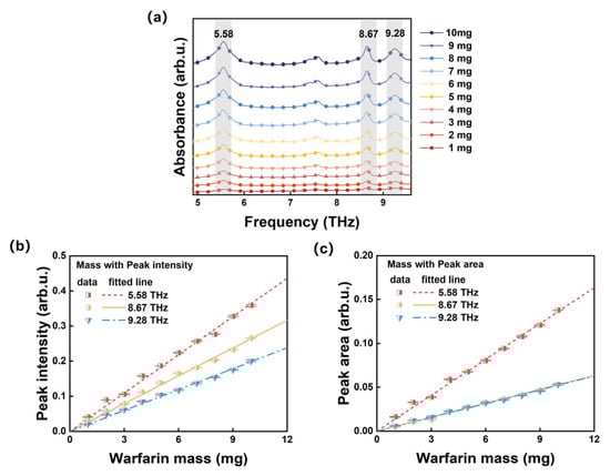 Furthermore, the linear relationship between the peak-integrated area and warfarin mass is depicted in Figure 5c, where we also constrained the intercept of the fitting function to zero for improved accuracy. The corresponding linear fitting function, which models the mass (x, in mg) versus peak area (y, in arbitrary units), is shown in Table 3. The key findings are as follows: (1) The slopes for the characteristic peaks at 8.67 THz and 9.28 THz are similar and lower than that at 5.58 THz, indicating that the highest sensitivity is at 5.58 THz. (2) The R2 values for all linear fitting results exceed 0.998, confirming a strong correlation between the fitted and experimental peak area and demonstrating high reliability of the fitting results.
