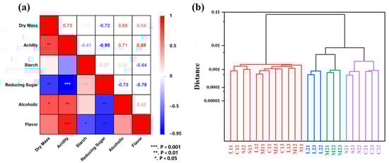 - Yu, Q.; Mou, F.Y.; Xiao, J.W.; Zhan, C.; Li, L.; Chang, X.; Dong, X.Y.; Chen, M.B.; Wang, X.R.; Chen, M.; et al. Correlational analysis of physicochemical indexes, microbial communities, and volatile components in light-flavor Daqu from north and south regions of China. World J. Microbiol. Biotechnol. 2024, 40, 54. [Google Scholar] [CrossRef]