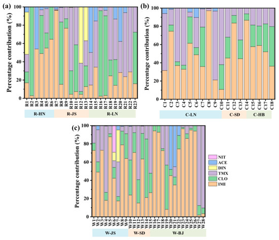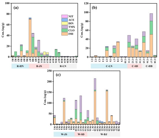 In the same province, the mean total concentrations of the detected NEOs in the wheat soil were higher than those in the corn soil in the SD and JS provinces and in the corn soil were higher than those in the rice soil in the LN provinces. As shown in Figure 3, the mean total concentrations of the detected NEOs in the collected soils from different crops followed: wheat (42.47 ng/g) > corn (22.08 ng/g) > rice (12.05 ng/g). The composition distribution of the detected NEOs in the different provinces and crop types of soils is shown in Figure 4. It indicated that three NEOs (i.e., IMI, CLO and TMX) accounted for 93.6–94.4% (mean, 94.1%), 97.2–100% (mean, 99.5%) and 94.1–99.6% (mean, 97.4%) in the rice, corn and wheat soil, respectively. The ACE with more than 40% detection rates only contributed 2.2%, 0.5% and 1.6% for the total concentrations of NEOs in the rice, corn and wheat soil. Considering the crop types, the mean contribution percentages of the detected IMI followed rice soil (43.2%) < corn soil (47.8%) < wheat soil (58.6%), the detected CLO followed rice soil (33.3%) > corn soil (22.6%) > wheat soil (13.8%) and the detected TMX followed rice soil (17.6%) < corn soil (19.1%) < wheat soil (24.9%), respectively. The results indicated that the total concentrations of NEOs was mainly composed of IMI, CLO, and TMX in the soils.