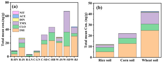 Total mean concentration of the detected NEOs in the (a) different provinces and (b) crop types of soils.