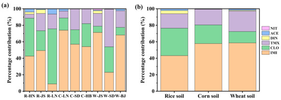 Composition distribution of the detected NEOs in the (a) different provinces and (b) crop types of soils.