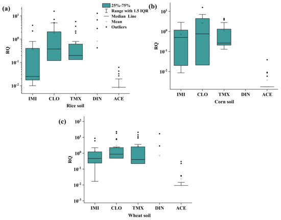 Ecotoxicological risk of the detected NEOs in the soil environment was assessed using the RQ method. In the present study, earthworms, Folsomia candida and Hypoaspis aculeifer were chosen as the ecological risk assessment object in the soil environment to assess the ecological risk of the exposure of NEOs. The ecological risk of the detected NEOs had a very close relationship with their concentrations in the soil and PNEC values. As shown in Figure 5, the median values of the RQ of IMI, CLO, TMX, DIN and ACE were 0.02, 0.21, 0.16, 0 and 0 in the rice soils, 0.50, 0.76, 0.26, 0 and 0 in the corn soils and 0.47, 0.87, 0.40, 0 and 0 in the wheat soils, respectively. This indicated that CLO and TMX in rice soils, IMI, CLO and TMX in corn soils and IMI, CLO and TMX in wheat soils would have a medium ecological risk with 0.1 < RQ < 1. A low ecological risk with a RQ < 0.1 was found for other detected NEOs in the soils. The max RQ values of the detected IMI (8.75), CLO (22.87), TMX (20.89) and DIN (16.85) were higher than 1 in the soils, indicating that the high ecological risk of single detected NEOs cannot be ignored. Yu et al. [24] found that the current residual levels of NEOs in the soils of an agricultural zone within the Pearl River Delta in South China could pose sub-lethal or acute effects to non-target terrestrial organisms such as earthworms. The application of IMI in peanut fields treated with flowable concentrate for seed treatment formulations also predicted low to moderate earthworm toxicity and a medium risk from ecotoxicity exposure [25]. Wu et al. [26] reported that the ecological risks of ACE and TMX were higher than other NEOs in the soils of tomato and cucumber greenhouses. Consequently, the ecological risks posed by pesticide residues in agricultural soils exhibit significant variation across different cropping systems. This underscores the critical need for enhanced environmental monitoring, with particular emphasis on NEOs in soil ecosystems.