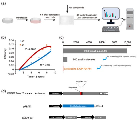 We first established a high-throughput platform for screening compounds that affect the CRISPR/Cas9 system. The platform was constructed based on the single-strand annealing (SSA) reporter activation via the CRISPR/Cas9 system. Then, we used the platform to edit the genes of the HEK 293FT cells. A scheme of the experimental procedure is shown in Figure 1a. The initial results show that, along with the prolongation of the CRISPR/Cas9 working time, the increasing trend of on-target efficiency was slowed down, while the increasing trend of off-target efficiency became more pronounced (Figure 1b). This phenomenon may be attributed to the fact that CRISPR/Cas9 preferentially targets specific sites. Once the target site has been edited, the CRISPR/Cas9 system is unable to effectively bind to the target site, leading to an increase in the off-target effects. Therefore, appropriately shortening the working time of CRISPR may reduce the off-target effects and maintain the on-target efficiency. Figure 1c shows the scheme of the in vitro screening to identify CRISPR/Cas9 modulators.