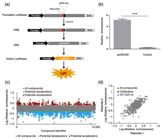 High-throughput screening to identify compound modulators of CRISPR/Cas9 efficiency based on the single-strand annealing (SSA) assay. (a) Scheme of CRISPR-based SSA reporter system combined with dual luciferase (firefly luciferase and Renilla luciferase). (b) Relative luminescence of CRISPR-based SSA. HEK 293FT cells were divided into two groups, the experimental group was transfected with the CRISPR-based SSA reporter vector and pX330-B3, the control group was transfected with the SSA reporter vector alone. Forty-eight hours after transfection, the dual luciferase (firefly luciferase and Renilla luciferase) activities were detected by the Promega GloMax-Multi Instrument. The statistical significant differences were determined by Student’s t-test (*** p < 0.001). (c) The first-round screening to identify CRISPR/Cas9 modulators from 9930 compounds. (d) The second-round screening of the 640 compounds.