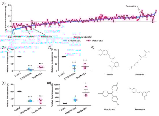 The following supporting information can be downloaded at: https://www.mdpi.com/article/10.3390/molecules30081811/s1, Table S1: Sequences of target sites for CRISPR; Table S2: Sequences of target sites for TALEN; Table S3: Sequences of primers used for vectors; Table S4: Sequences of primers used for next-generation sequencing; Table S5: The IDs and relative luminescence activities (log value) of the 9930 compounds.