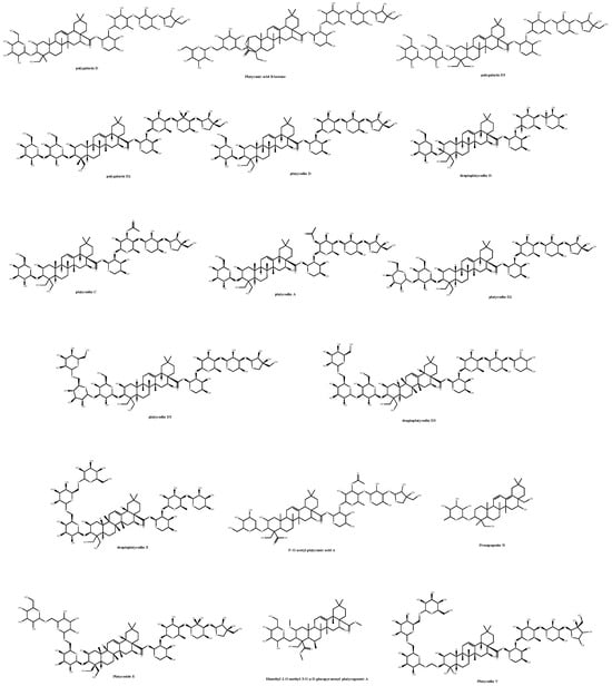 In this study, molecular docking and quantum chemistry simulations play an important role in predicting the binding capacity and interactions of P. grandiflorum saponins in the binding sites of key proteins involved in the neurodegenerative pathways. ADMET analysis was employed to indicate the oral bioavailability of these saponins and their nutraceutical use; dimethyl 2-O-methyl-3-O-a-D-glucopyranosyl, platycogenate A, polygalacin D2, platycodin C, platycodin D, prosapogenin D, deapioplatycodin D, platycodin D2, platycodin D3, deapioplatycodin D3, deapioplatycoside E, platyconic acid B lactone, platycodin A, 3″-O-acetylplatyconic acid A, polygalacin D, polygalacin D3, platycodin V, platycoside E, and polygalacin XI comprised the investigated list in this article (Figure 1).