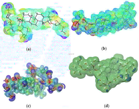(a) Polygalacin D electrostatic potential, (b) prosapogenin D electrostatic potential, (c) platycodin D electrostatic potential, (d) polygalacin D2.