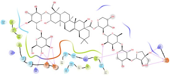 Maestro 2018 conducted protein–ligand docking, which was further evaluated through MD simulation, RMSD, RMSF, radius of gyration, and the number of hydrogen bonds in protein–ligand interactions. A model system was formulated for polygalacin D2 as an inhibitor for synapsin I and BACE1 and platycodin D as the NMDA inhibitor. Polygalacin D was employed as an inhibitor of synapsin II, III, and GSK-3β. The type of interaction between the residues of the ligand–protein complex is shown in Table 2.