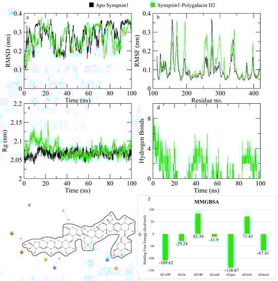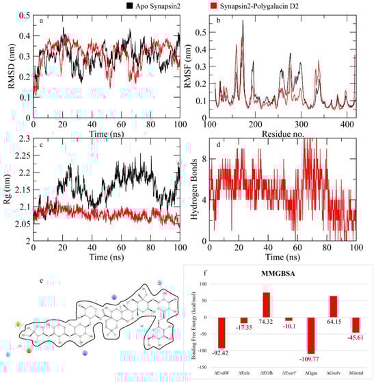 The simulation analysis. (a) The RMSD of Cα atoms of the apo protein and complex. (b) The flexibility of protein residues upon binding of the ligand. (c) Radius of gyration calculation of protein upon binding the ligand. (d) The hydrogen bonds calculation between the protein and ligand. (e) The molecular simulation result between polygalacin D and synapsin II. (f) The total binding free energy of energy components in the synapsin II–polygalacin D complex.