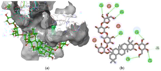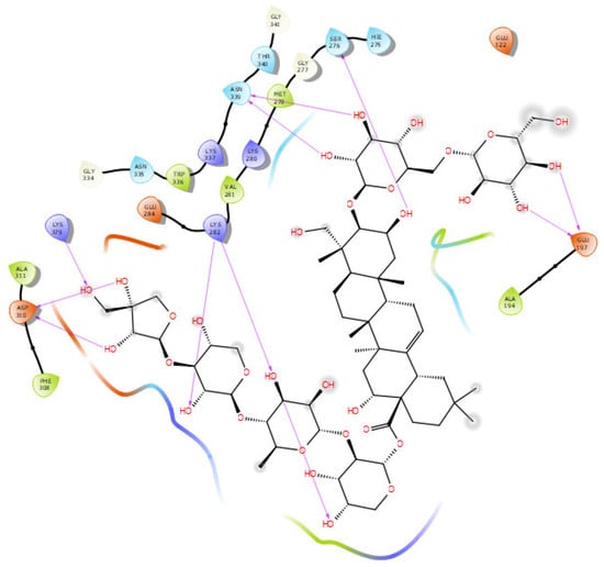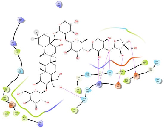 The platycodin D sugar part formed stable polar bonds with asp200, asp181, lys183, ser66, and asn186; whereas, its aglycone interacted with val70, phe67, cys199, ile62, leu188, ala83, leu132, val110, tyr134, val135, and tyr140, where most of them matched the used standard drugs.