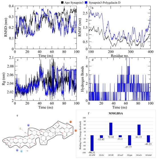 The simulation analysis. (a) The RMSD of Cα atoms of the apo protein and complex. (b) The flexibility of protein residues upon binding of the ligand. (c) Radius of gyration calculation of protein upon binding the ligand. (d) The hydrogen bonds calculation between the protein and ligand. (e) The molecular simulation result between polygalacin D and synapsin III. (f) The total binding free energy of energy components in the synapsin III–polygalacin D complex.