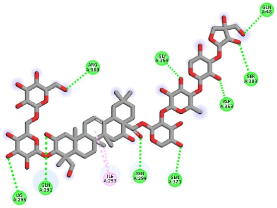 The docked complexes and residue-specific interactions of the NMDA receptors with polygalacin D2, polygalacin D, and donepezil (control) are illustrated in Table 2, respectively. Polygalacin D2 and platycodin D were docked in a similar lateral orientation featuring a new location distinct from the standards, yet displayed better glide docking scores of −7.755 and −7.296 Kcal/mol, respectively. Polygalacin D2 manifested hydrogen bonds to the key residue lys296 with distance 2.51 A and gln291 with distances 2.31 and 2.34 A (Figure 10) and extended hydrophobic forces to leu280, leu377, met375, ile275, and leu292 as well as ile293, val355, and ala307, which are characteristic to the binding features of ifenoprodil and ly-2811375.