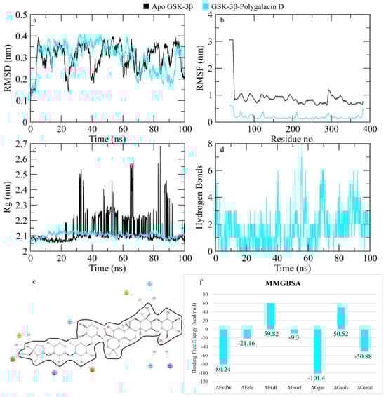 MD simulation measurements of the GSK-3β–polygalacin D complex. (a) The RMSD of Cα atoms of the apo protein and complex. (b) The flexibility of protein residues upon binding of the ligand. (c) Radius of gyration calculation of protein upon binding the ligand. (d) The hydrogen bonds calculation between the protein and ligand. (e) The molecular simulation result between polygalacin D and GSK-3β. (f) The total binding free energy of energy components in the GSK-3β–polygalacin D complex.