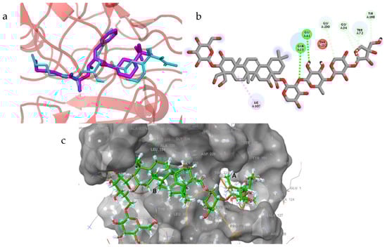 Redocking of the co-crystallized native ligand in the BACE1 enzyme. (a) Superimposition of the docked and co-crystallized native ligand (b) Docking interactions of platycodin D in the binding pocket of BACE1. (c) Polygalacin D2 in the binding pocket of BACE1.