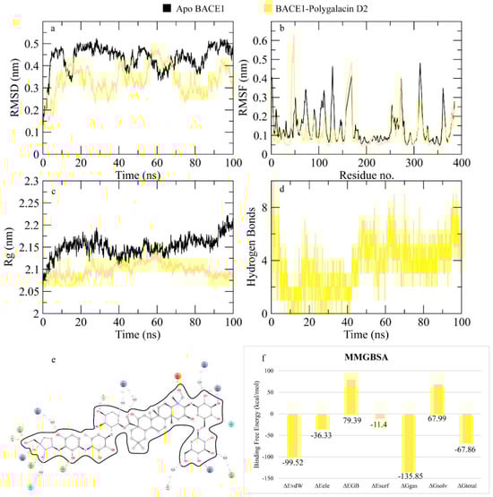 MD simulation data of the BACE1– polygalacin D complex. (a) The RMSD of Cα atoms of the apo protein and complex. (b) The flexibility of protein residues upon binding of the ligand. (c) Radius of gyration calculation of protein upon binding the ligand. (d) The hydrogen bonds calculation between the protein and ligand. (e) The molecular simulation result between polygalacin D and BACE1. (f) The total binding free energy of energy components in the BACE1–polygalacin D complex.