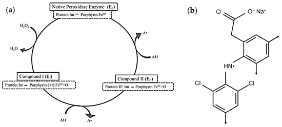 Enzymatic treatment has been applied successfully as an effective wastewater treatment method for various emerging contaminants in water and wastewater including NSAIDs. Soybean seedcoat peroxidase (SBP; phenolic donor:hydrogen-peroxide oxidoreductase; EC 1.11.1.7) has demonstrated the ability to catalyze the oxidation of a variety of different compounds. The peroxidase cycle is shown in Figure 1a [16]. The reactive radicals generated, A. in Figure 1a, couple non-enzymatically by C-C coupling (N-C is possible but unlikely due to steric crowding) with ortho-, para-orientation to form dimers, Figure 1b, that grow analogously with additional peroxidase cycles until they reach their solubility limit and precipitate and can be removed by filtration or sedimentation. In some cases, literature references are given below for laccase-catalyzed reactions of arylamine substrates because that enzyme class generates the same aryl free radicals, which then couple non-enzymatically as for the peroxidase-catalyzed reactions [17].
